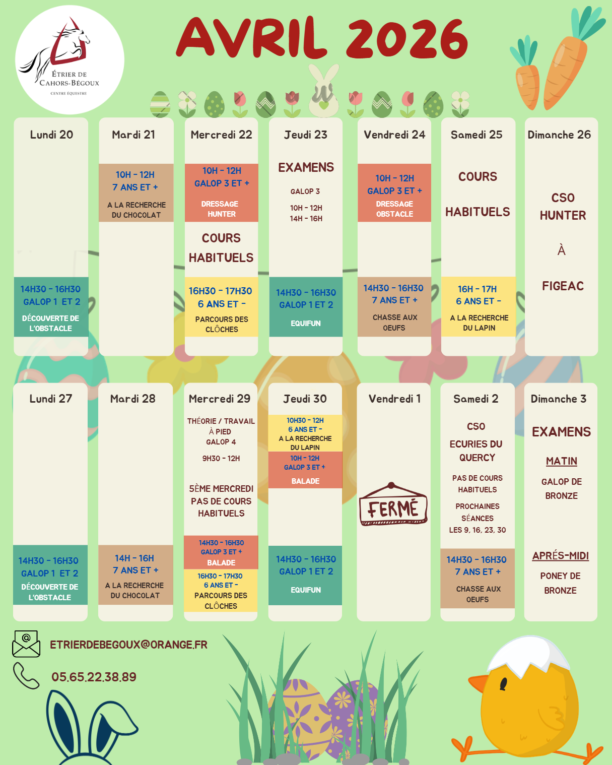 Retrouvez le planning des vacances de printemps avec de nombreuses activités pour tous les niveaux ! Seront également organisés les examens Poney, Galop de Bronze, Galop 3 et Galop 4. Un CSO aux Ecuries du Quercy et un CSO/Hunter à Figeac sont aussi prévus !